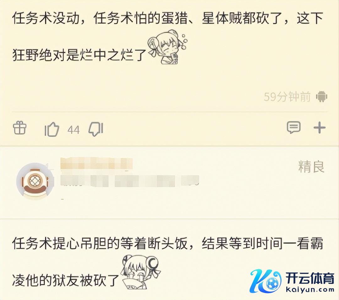 而狂野模式一张0费回30血的神卡“养息石”相似也没被砍,这引起了许多玩家的动怒:“任务术没动,任务术怕的蛋猎、星体贼王人砍了,这下狂野十足是烂中之烂了”,“任务术心惊肉跳的等着断头饭,效果比及期间一看霸凌他的狱友被砍了”,“策画师到底玩不玩游戏啊”……