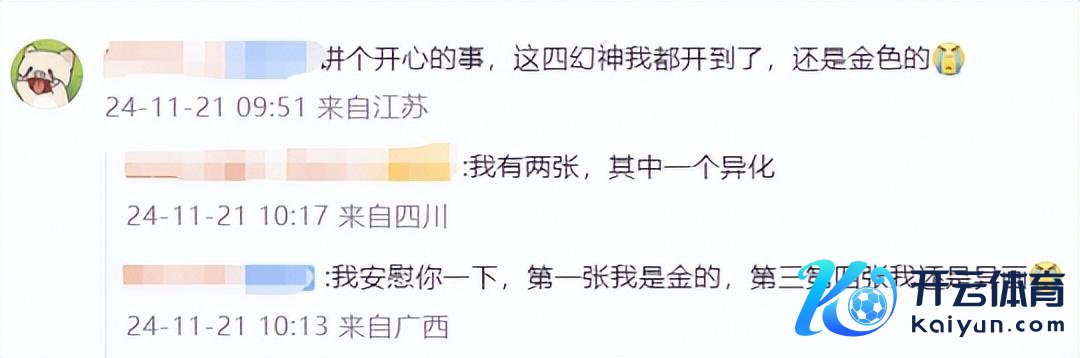 对此,开到这些卡牌的非酋玩家王人灰心了:“讲个欣喜的事,这四幻神我王人开到了,还是金色的”,“我刚好开到了仨,还是俩异画”,“系数也没开开出几张橙卡,我尽然有这内部的两张”……