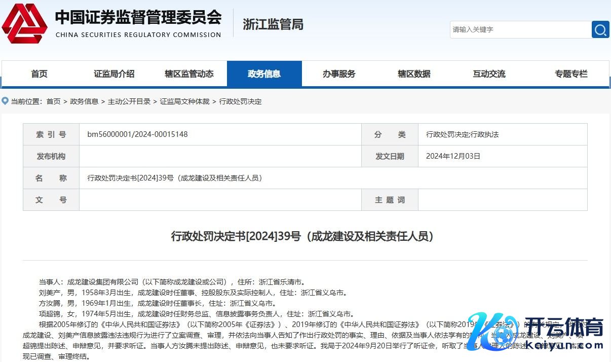 【大河财立方音书】12月5日音书云开体育,浙江证监局近日清楚的一则行政处分决定书透露,成龙建造集团有限公司(以下简称成龙建造)因存在财务作秀等犯法事实,日前被责令改正,给予教养,并处以1150万元罚金。