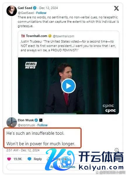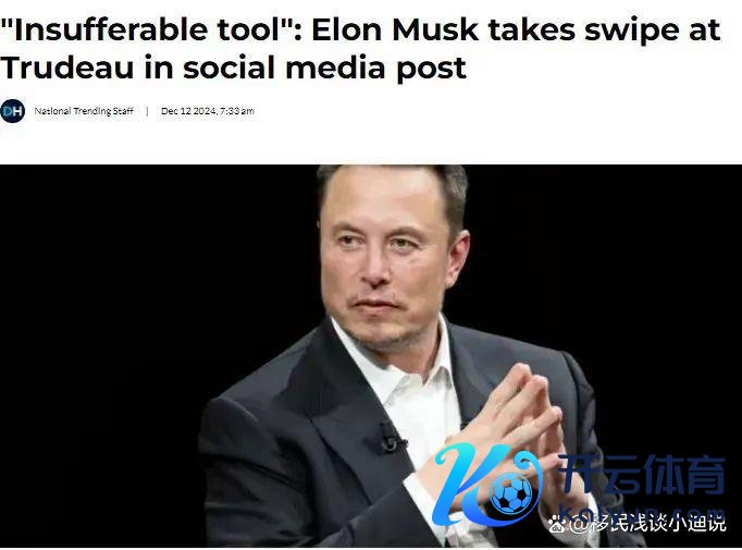 2024年12月12日,好意思国候任“政府成果部”部长,同期亦然加拿大公民身份的伊隆·马斯克终于疾恶如仇的在搪塞媒体对加拿大总理特鲁多作念出了闭幕预言:“特鲁多是令东谈主无法隐忍的器用.......他不会掌权太深化.....”