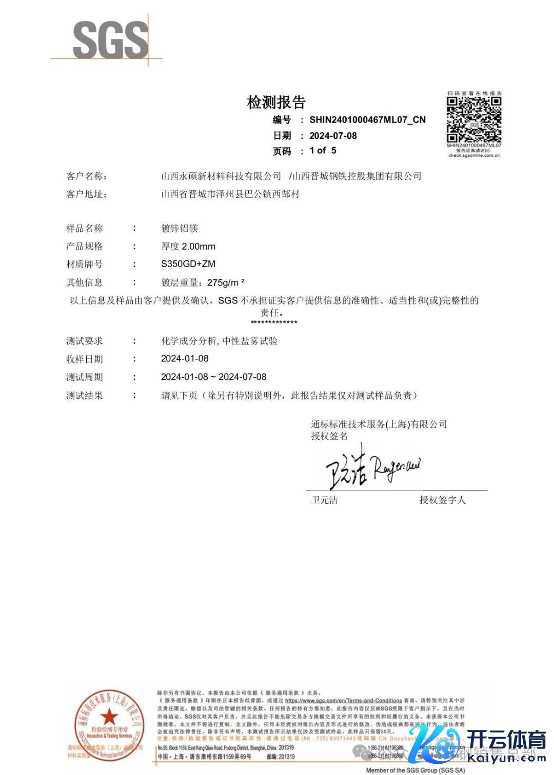 晋钢锌铝镁通过泰斗机构SGS第三方盐雾视察4000小时测试,为晋钢锌铝镁产物应用于实地环境提供了有劲的事实依据。应用于此神情不错平日出具30年使用寿命的质保,获得了神情方的招供。
