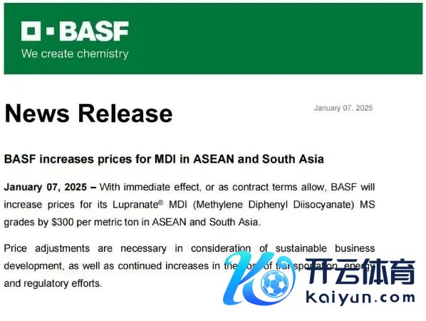 慧正资讯,巴斯夫文牍自1月7日起,对其MDI在东盟地区和南亚地区进行提价,本次提价幅度为300好意思元/吨。巴斯夫称,这次提价的原因是物流运载、动力和监管本钱的捏续增长,为保管频频运营作念出的必要提价。东盟地区包括开云官网切尔西赞助商,文莱、柬埔寨、印度尼西亚、老挝、马来西亚、菲律宾、新加坡、泰国、缅甸、越南;南亚地区涵盖阿富汗、孟加拉国、不丹、印度、马尔代夫、尼泊尔、巴基斯坦、斯里兰卡。