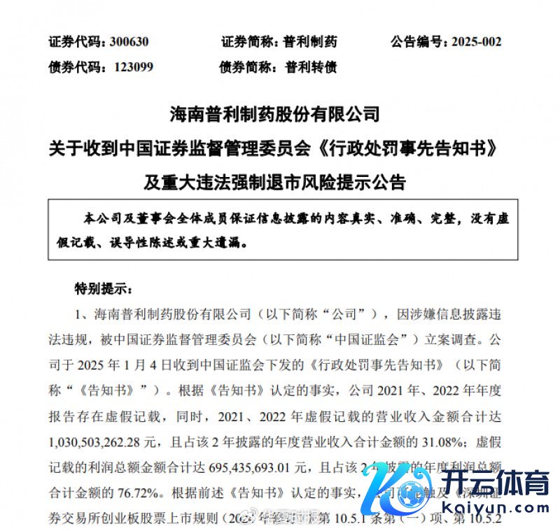 2024年4月,普利制药公告称海南证监局在现场查验中发现普利制药2021年、2022年年报中营收、利润等财务信息败露不准确,条目其对关联年度营收、利润等财务信息的信得过性、准确性进行自查。5月,因未在法如期限内败露2023年年报,普利制药遭中国证监会立案拜谒,公司股票及可诊疗公司债券自5月6日起停牌。
