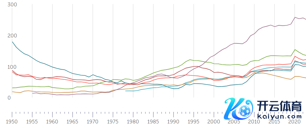 图 1950-2023西方七国政府欠债与GDP之比的变化趋势