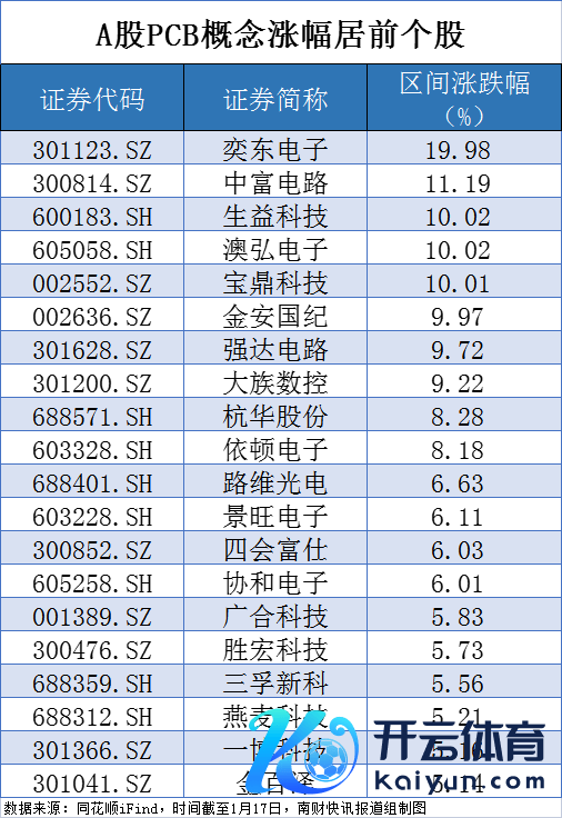 1月17日,PCB办法捏续走强,同花顺iFinD数据透露,该板块指数本日高潮2%。身分股中,奕东电子(301123.SZ)20CM涨停,澳弘电子(605058.SH)、金安国纪(002636.SZ)、生益科技(600183.SH)等多股涨停,富门户控(301200.SZ)、杭华股份(688571.SH)等股跟涨。
