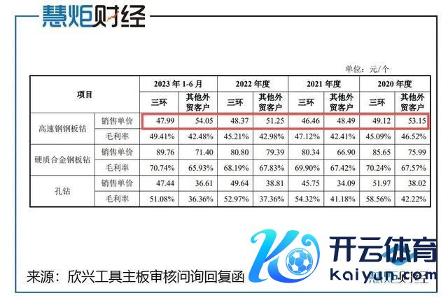 根据主板问询恢复表露数据,2020年至2023年上半年,欣兴器用对其他主要外贸客户(非三环收支口)高速钢钢板钻平均销售单价区别为53.15元/个、48.49元/个、51.25元/个、54.05元/个,举座保握自如;而同期对三环收支口的高速钢钢板钻平均销售单价区别为49.12元/个、46.46元/个、48.37元/个、47.99元/个,永恒低于其他主要外贸客户单价,2020年价差4.03元/个,价差率7.58%;2021年价差2.03元/个,价差率4.19%;2022年价差2.88元/个,价差率5.62%;2023年上半年价差6.06元/个,价差率11.21%,举座价差率保管在4%-12%区间,其中2023年上半年价差及价差率显耀攀升,荒谬特征更为高出。