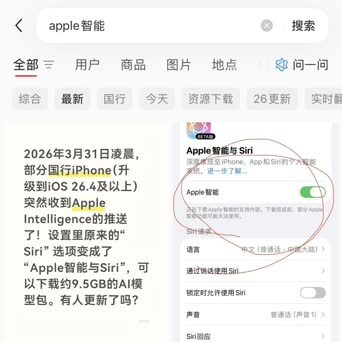 今天凌晨,外传中的苹果智能(Apple Intelligence )在中国区阛阓低调上线。多名小红书用户反映,在我方的iPhone更新最新系统(iOS26.4)后,可在修复选项中看到“Siri”已升级成“Apple 智能与 Siri”。当在修复中开启“Apple智能”后,可体验全新Siri、AI写稿、AI作念图、AI撤消、视觉智能、翻译等AI功能。【P1】